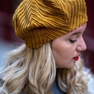 Infuse your wardrobe with a warm vintage touch through this corduroy beret. The golden mustard hue brings both vibrancy and autumnal coziness, while the ribbed fabric texture adds depth and timeless charm.